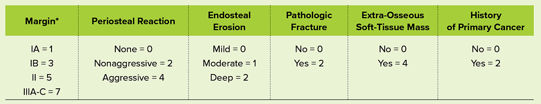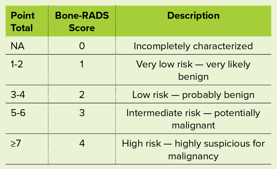 The Bone-RADS score is a numerical scale from 1 to 4 with corresponding risk assignments (very low, low, intermediate, high). The score is based on numerous factors, such as a patient’s imaging and past oncologic history. Radiographic findings that predict risk include margination, pattern of periosteal reaction, depth of endosteal erosion, pathological fracture, and extra-osseus soft-tissue mass (Table 1). Points from each of these categories are summed, and the total corresponds with a Bone-RADS score, with 1-2 meaning very low risk, 3-4 meaning low risk, 5-6 meaning intermediate risk, and 7 meaning high risk of malignancy (Table 2). Management recommendations are made for further surveillance or referral to orthopaedic oncology. The categories of the Bone-RADS score are listed below.