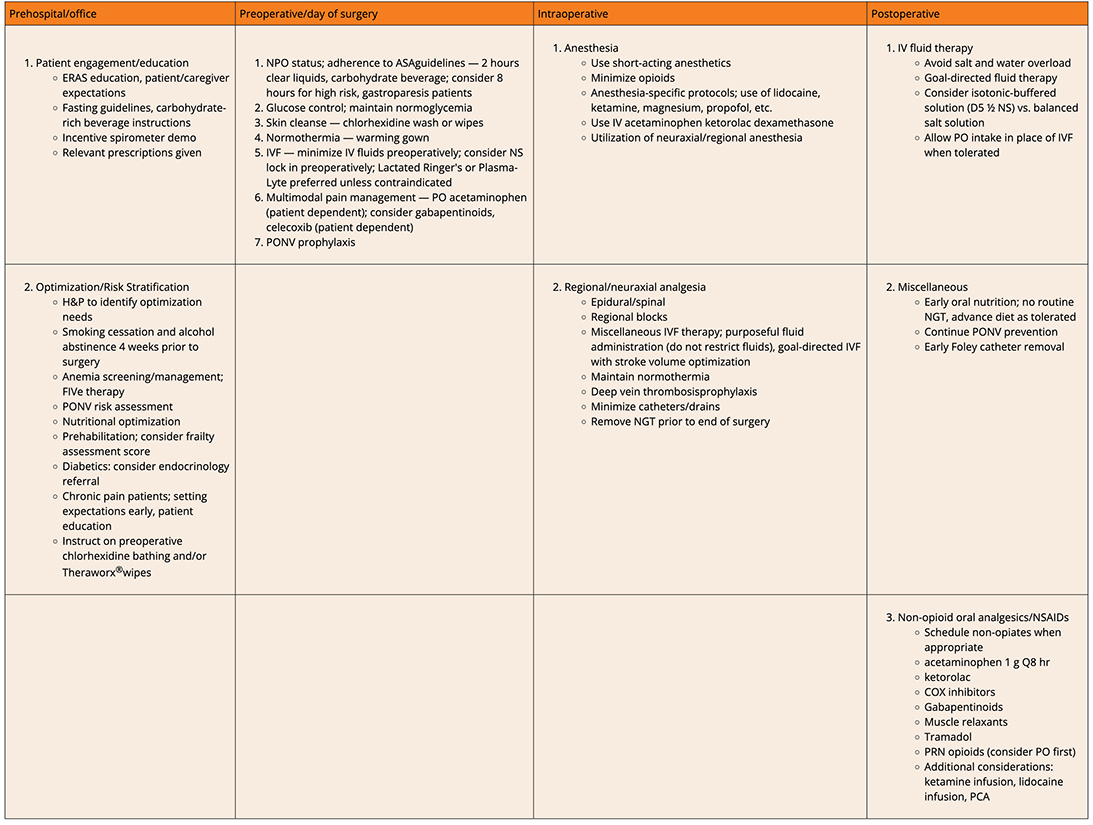 Day of surgery/intraoperative factors considered are atraumatic surgical techniques, standardized anesthesia/analgesia protocols, multimodal opioid sparing analgesia regimens, and promotion of normovolemia, normothermia, and prevention of hypoxia.