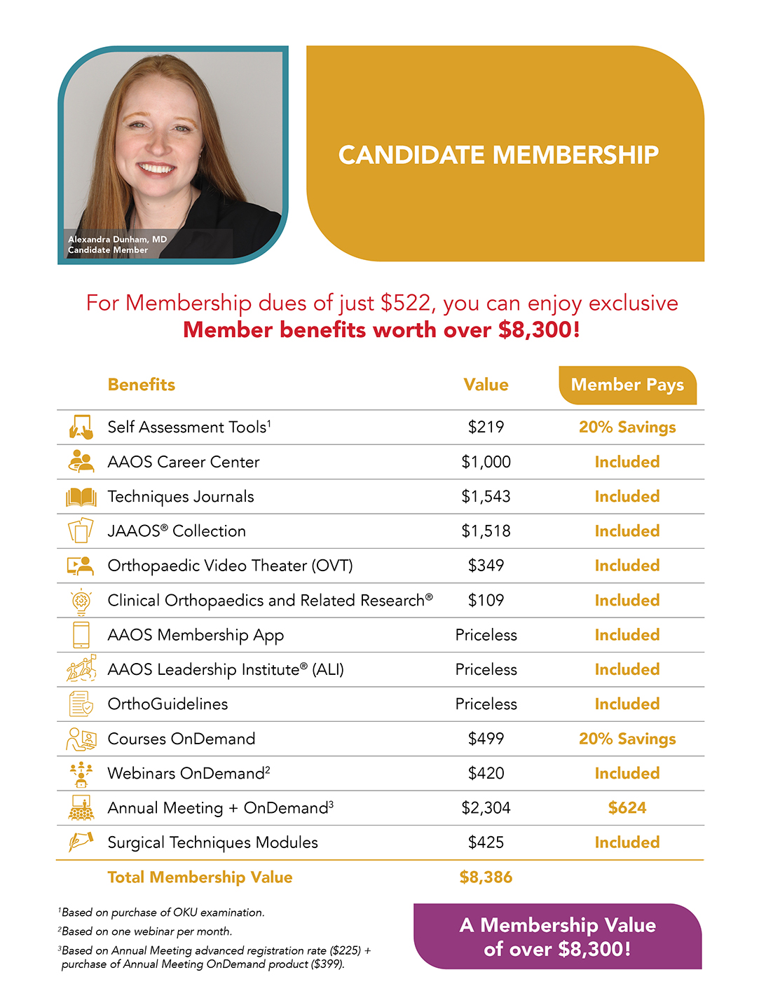 Enjoy the full value of Candidate Membership in 2025 with dues at $522 and a special, early-bird Annual Meeting registration member rate of $225*. Your $747 investment unlocks over $8,300 in exclusive benefits—each designed to keep you at the leading edge of orthopaedic excellence. Dive into the benefits below see all that awaits!