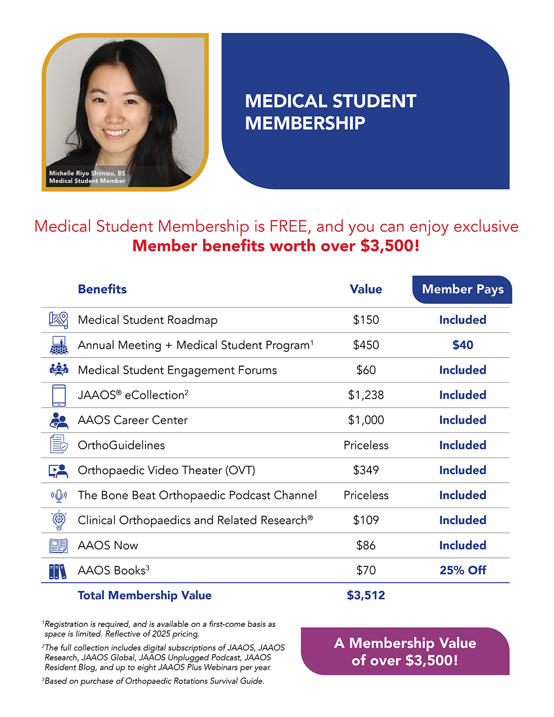 For 2025, Medical Student Membership is FREE. Medical Student Members can access exclusive Member resources, research, and discounts with a value of more than $3,500. Registration for the 2025 Annual Meeting for Medical Student Members is $40.