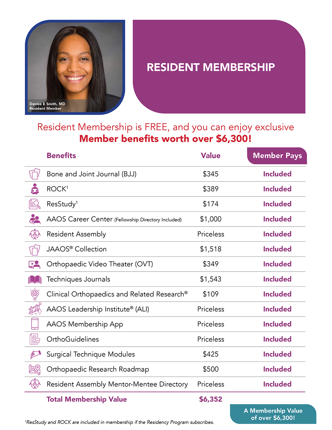 Resident Membership is complimentary while you participate in an approved orthopaedic residency program. Resident Members can access all the benefits shown below plus more for a total 2025 Membership value of more than $6,300.