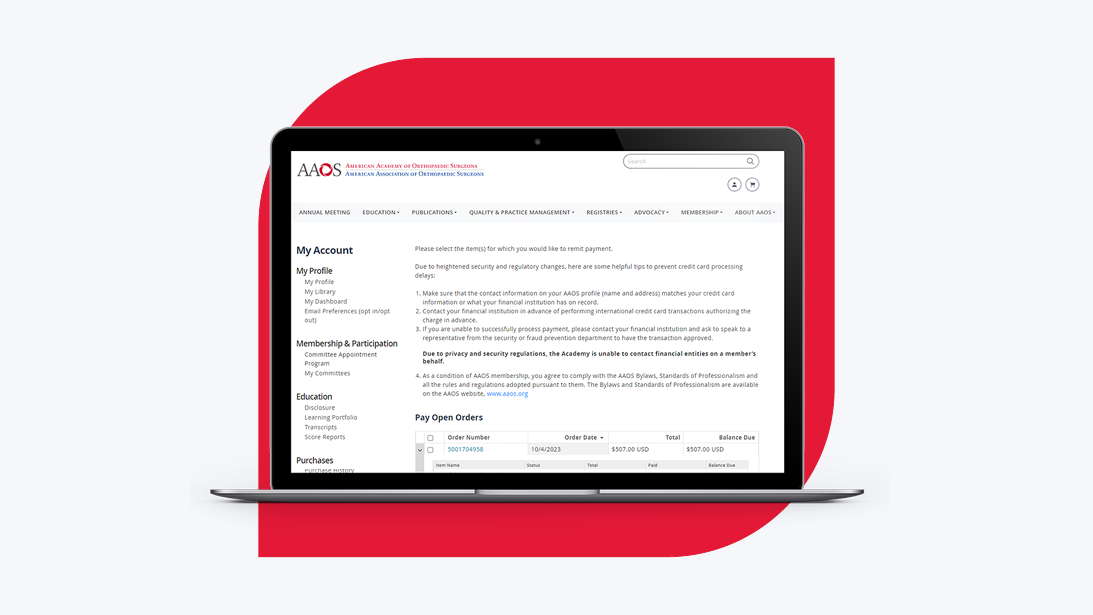 My AAOS is your one-stop shop to help self-service your AAOS membership. Navigate your account quickly and easily by clicking the cards below so you get the most of your membership. You can also access all of your “My AAOS” features by clicking on the Person icon in the top right corner of the AAOS website, next to the shopping cart icon.
