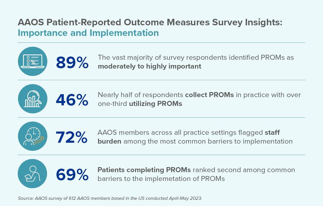 With reimbursement increasingly tied to outcomes under value-based healthcare, PROs are becoming more integrated into clinical practice and policy. To analyze the use and application of PROMs among orthopaedic surgeons, the AAOS conducted a survey of its members asking them to characterize their PROM usage. The results found:
