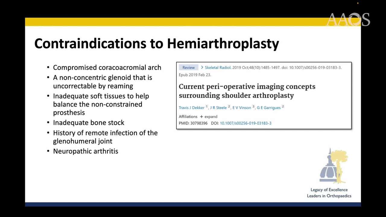 Discussion: In this case, conversion from a RTSA to hemiarthroplasty in an 84-year-old female provided pain relief and stable implant fixation in the setting of glenoid baseplate loosening, fractures of the scapular spine, and poor bone stock. Given the patient’s advanced age and limited functional demands, hemiarthroplasty served as an appropriate salvage procedure that would best alleviate the patient’s pain, as revision RTSA was not feasible.